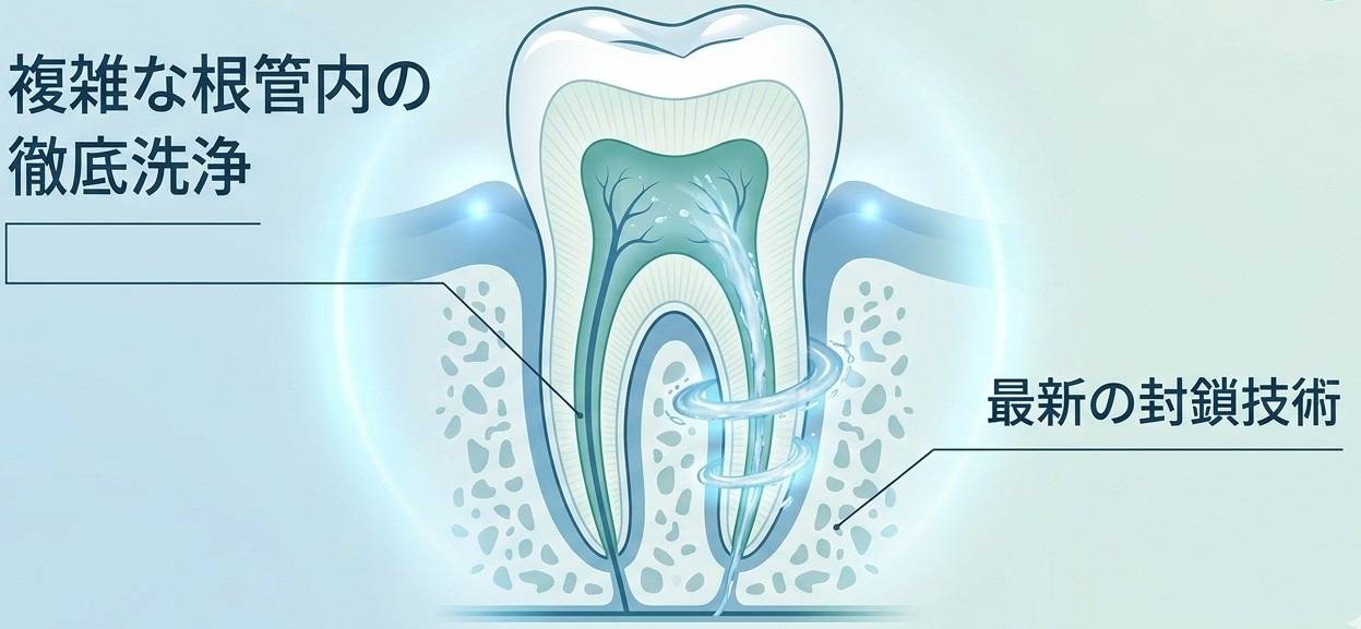 複雑に枝分かれした根管の隅々まで、洗浄水だけの器具では届きません。当院では音波振動を利用したエンドアクチベーターを導入し、洗浄水を根管の細部にまで行き渡らせることで、細菌の住みか(バイオフィルム)を物理的に破壊・除去します。